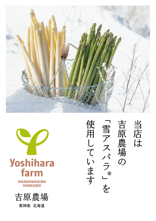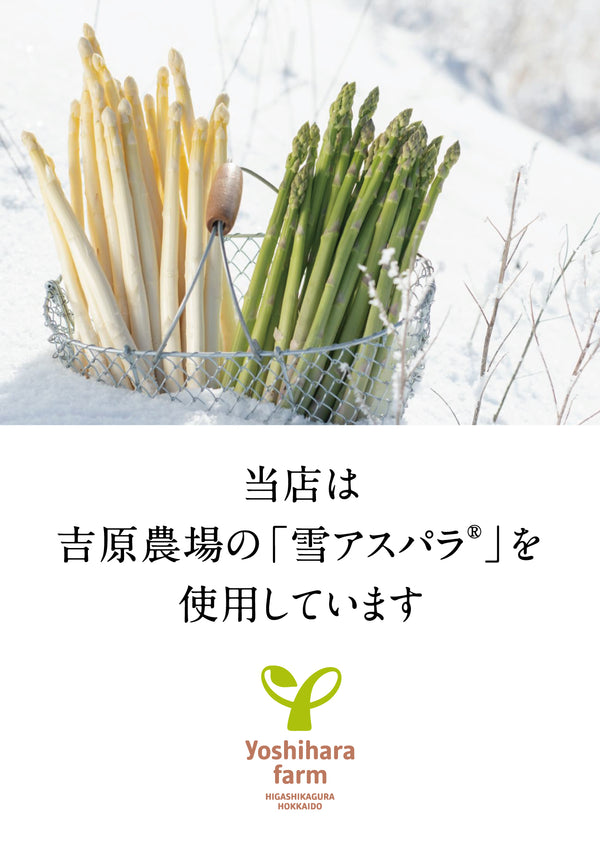 冬に旬を迎える当農場の雪アスパラ®は、12月~2月限定で収穫される特別なアスパラです。グリーンとホワイトの2種類があり、夏のものとは異なる、これまでにない究極のおいしさを追い求めています。 グリーン・アスパラは、アスパラらしい風味を残しつつ、驚くほど柔らかい食感とみずみずしさが特徴です。ホワイト・アスパラは、根元ほどきわだって強い甘みを感じられる、まったく新しい味わいをもつ逸品です。 冬のメイン食材となる地域特産の野菜を作り、届けたいという想いから生まれた雪アスパラ®。これまで多くのお客様に喜んでいただいています。